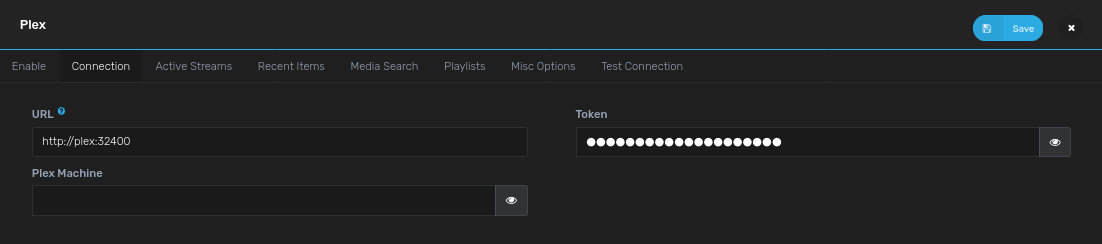 • Click on the Connection Tab and set "Plex URL": http://plex:32400