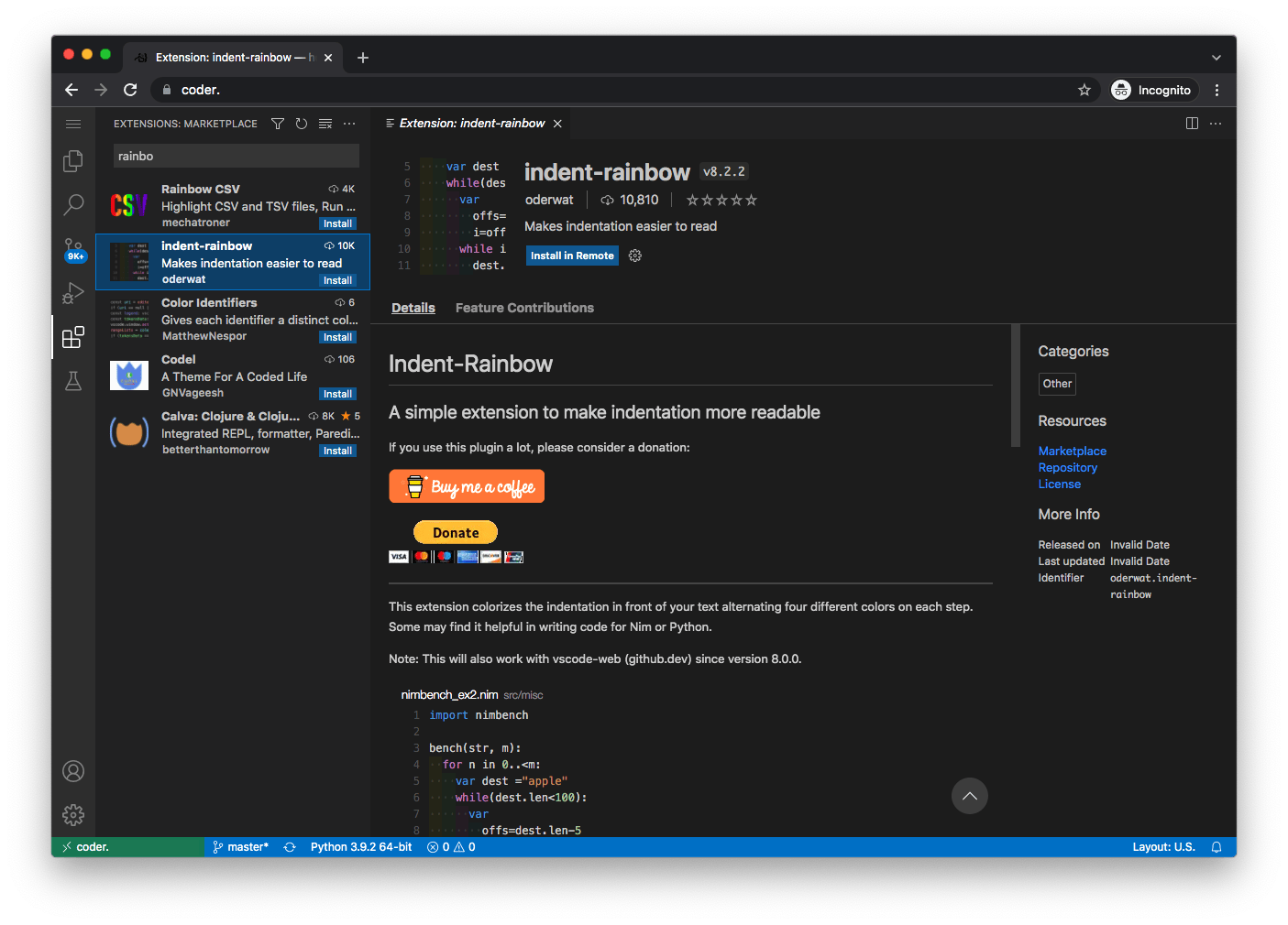 Now, with these extensions installed, you should have syntax highlighting and indentation coloring for: